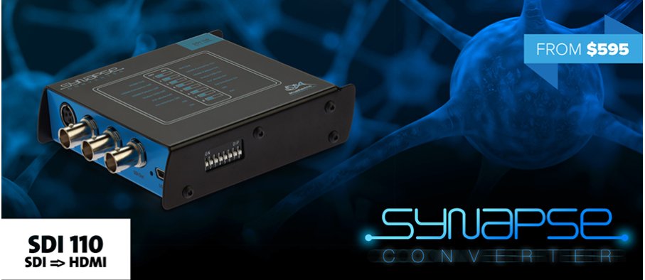 The Bluefish444 SDI110 Synapse Converter delivers high-quality SDI to HDMI video and audio signal processing in a small form-factor, with second-to-none build quality and reliability. Bluefish444 Synapse Converters are designed and manufactured to the same exacting standards as our world-renowned uncompressed SDI video cards, and include professional features such as lockable power supplies, redundant I/Os and video downconverters.